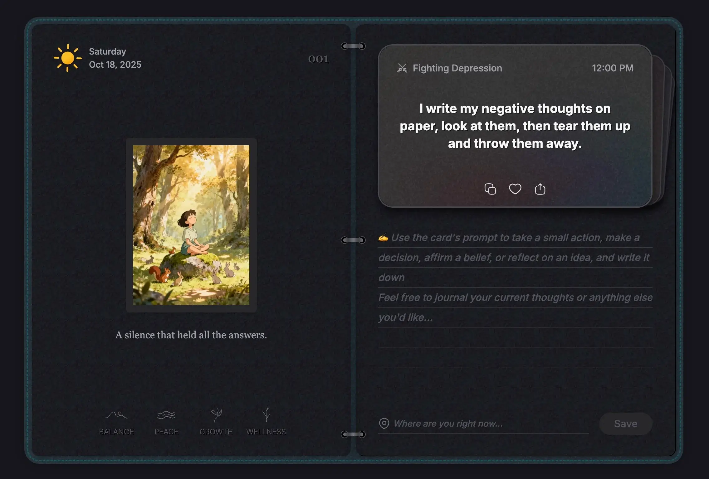 Write down your reflections, small actions, decisions, or anything you feel is worth noting under each card, just like keeping a journal.