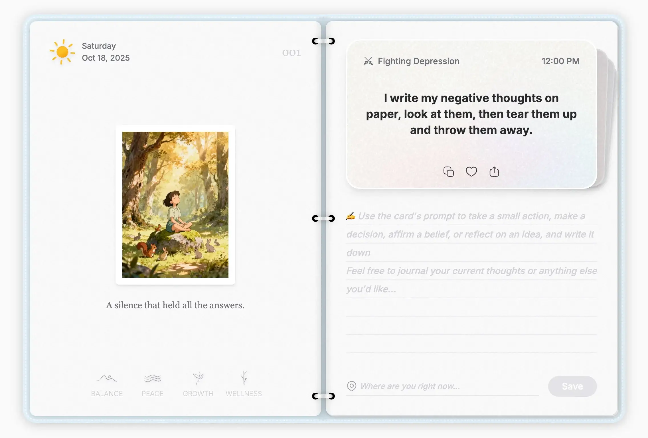 Write down your reflections, small actions, decisions, or anything you feel is worth noting under each card, just like keeping a journal.